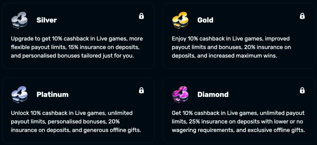 VIP members enjoy a range of exclusive perks, including a dedicated VIP manager, increased payout limits, daily deposit insurance, weekly cashback, birthday gifts and access to private VIP events.