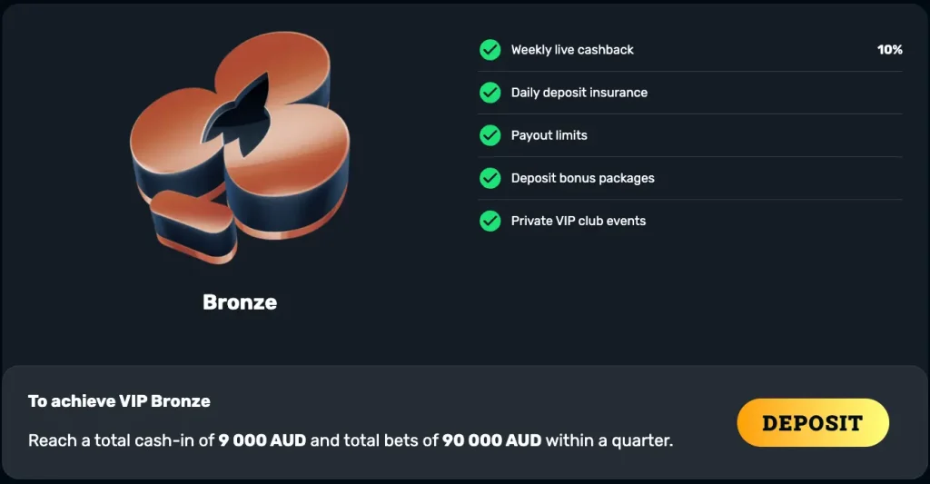 Progression is based on your total deposits and bets within a quarter. For example, to reach the Bronze level, you must deposit 9,000 AUD and place bets of 90,000 AUD within the specified time frame.
